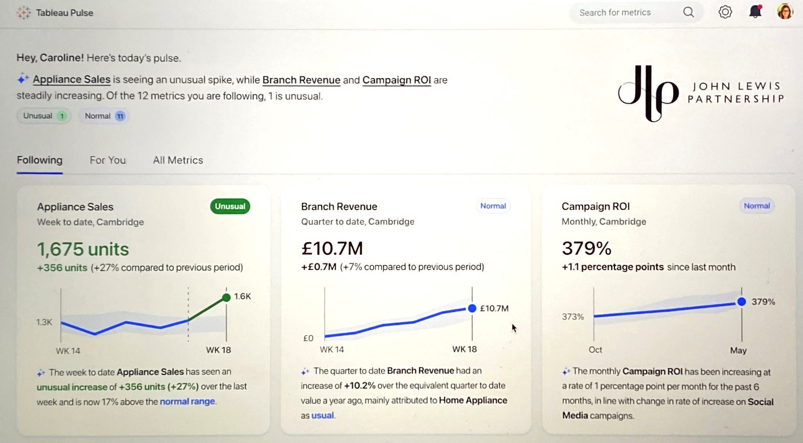 Tableau Pulse, as pilot tested by John Lewis Partnership, blends analyst-definedmetrics, business context, sparkline visualizations and generative AI explanations in card views that can be pushed to targeted users through email, Slack, or web landing pages.