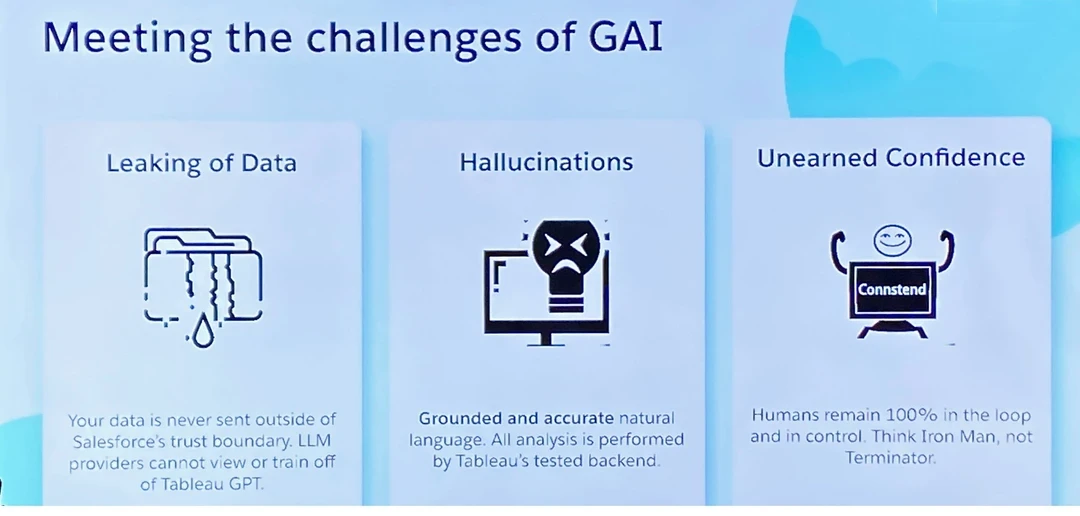 Tableau offered three reassurances about how Tableau GPT will work. First, customer data will never be sent outside the âSalesforce trust boundary,â meaning LLMs wonât be able to train on customer data. Second, the language generated by Tableau GPT will always be grounded in facts and analyses done by the Tableau Analytics Engine â so the LLM canât âhallucinateâ and make up facts, Tableau insists. Third, humans will always remain in the loop, so âthink Iron Manâ (a human assisted by technology) ânot terminatorâ (a robot with its own agenda).