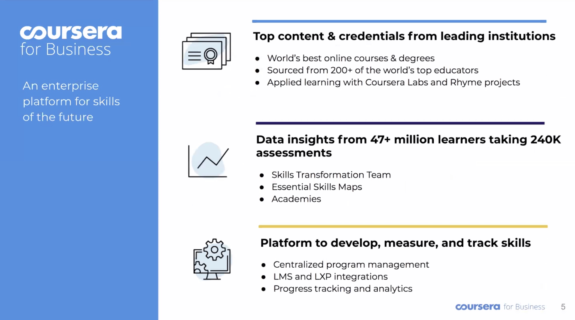 Coursera is proud of its connection to top traditional educators like Duke University and Yale, as well the cutting-edge addition of what it calls applied learning, basically hands-on education, with its Coursera Labs and Rhyme projects. While education has always tended to be data-driven, Coursera is also driving differentiation and network effects by wielding the insights that it's gathering from its 47 million learners, who can take over 240,000 different assessments, providing a rich tapesty of learning data that the company can turn into useful insights for individual learners, corporate customers, and its own product development. Coursera is a full digital platform intended as a modern answer to what organizations need today to develop, measure, and track skills. It has centralized learning program management capabilities like you would expect from a more-traditional LMS. It also has student progress tracking and analysis, as well as integrations back into three other types of associated systems: LMS platforms, the emerging category of learning experience platforms (LXPs), and HRIS systems, to build bridges to other parts of the organization that also manage or track learning.