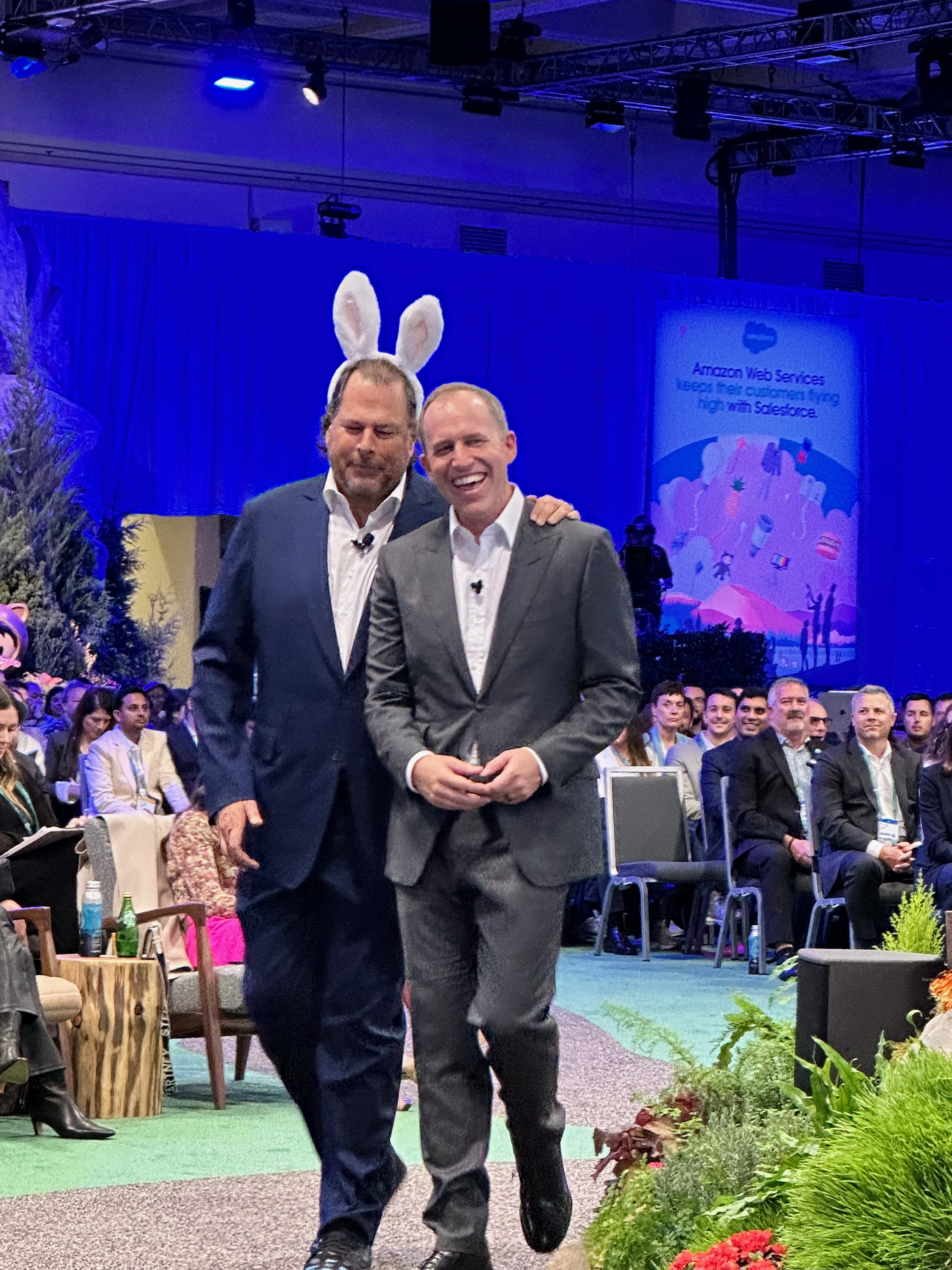 The keynote exemplified the balance that the co-CEOs seem to bring to the overarching leadership of Salesforce itself: dreams of massive, unfettered innovation and the steady pragmatic knowledge that takes those dreams and turns them into reality. The ultimate display of this partnership was when Benioff playfully slapped bunny ears on himself to joyously herald the entry of Genie to the Salesforce fold. Without missing a beat, laughing and rolling with the fun, Taylor proceeded to interview the digital leader of Ford Motors about their capacity to transform their driver and customer experience with Salesforce. Nothing to see here folksâ¦just another day at the office. Moments later, Taylor had his own bunny ears, willing to join the fun to the thrill of the MVPs sitting one section away. Yes, there is a playfulness. But through the entire keynote, you didnât just see the co-respect of these co-CEOs, you could feel it.