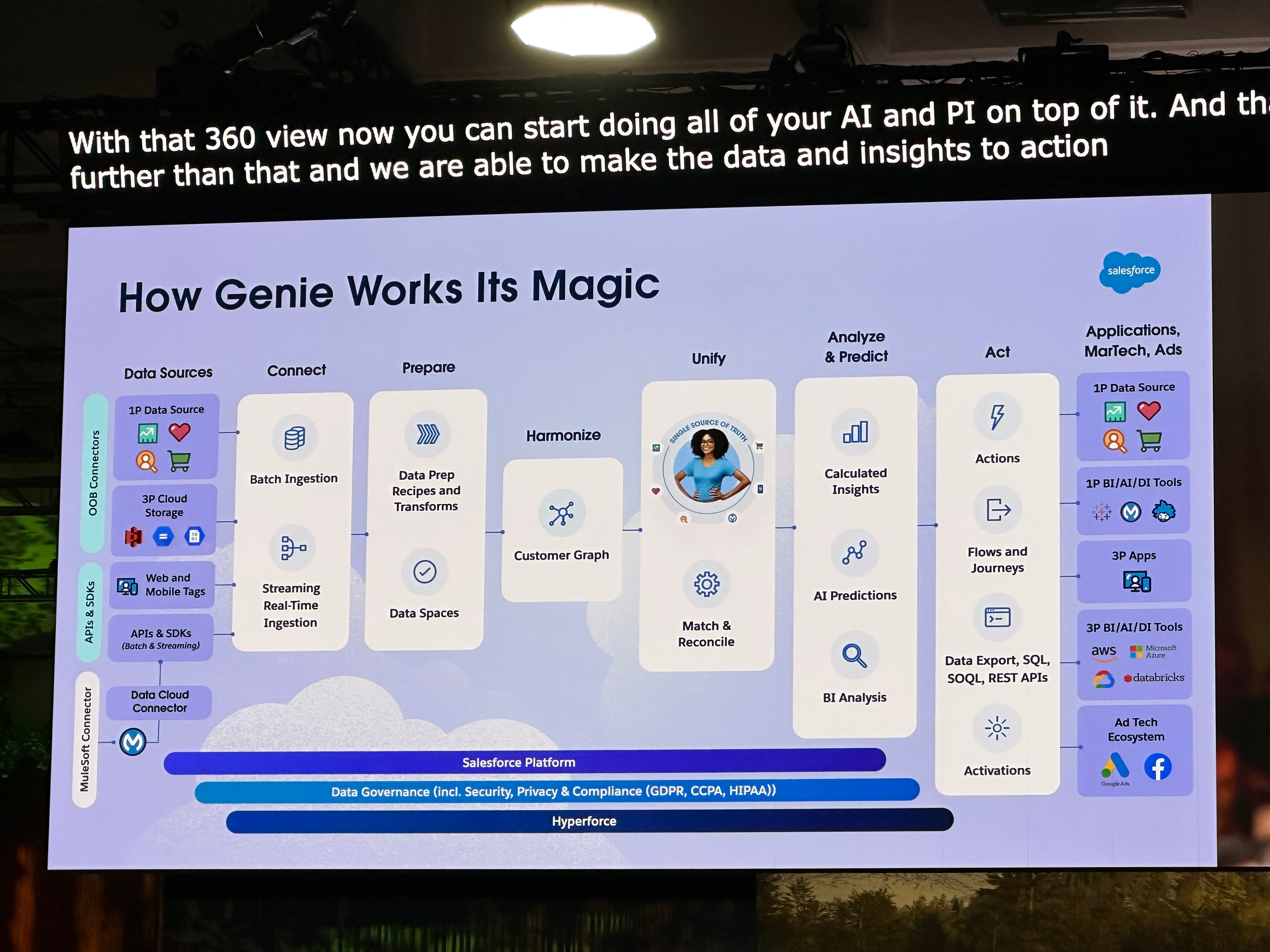 Now to the meat of Dreamforce: the announcements. Genie was the big magical reveal. Salesforce more directly calls this data service a hyperscale real-time data platform. Genie extends the power of traditionally siloed Marketing CDP to the entirety of the customer experience (CX) front line. Intended as a shared service across all clouds, Genie, as one would expect from a CDP, unifies and harmonizes a broad and complex array of customer data into a persistent record of a customer, available to power personalization and focused, relevant engagement regardless of function.