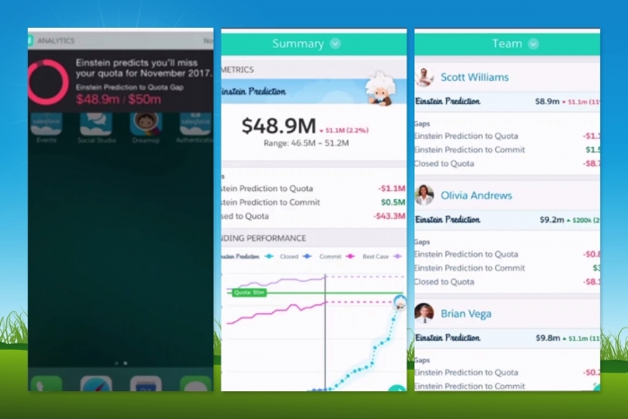 - Einstein Forecasting - Leveraging predictive forecasting capabilities gained from the Implisit acquisition, Salesforce announced Einstein Forecasting back in September. The solution uses machine learning to analyze the data housed in Salesforce CRM with a variety of internal and external factors such as historical performance, customer engagement, etc. to provide individual and team level sales forecasts. The demo during the Sales Cloud keynote showed how a sales manager would receive a mobile notification of a quota gap and with three clicks, drill into team performance, the individual seller, and the individual opportunities to view Einsteinâs findings to address the gap.
