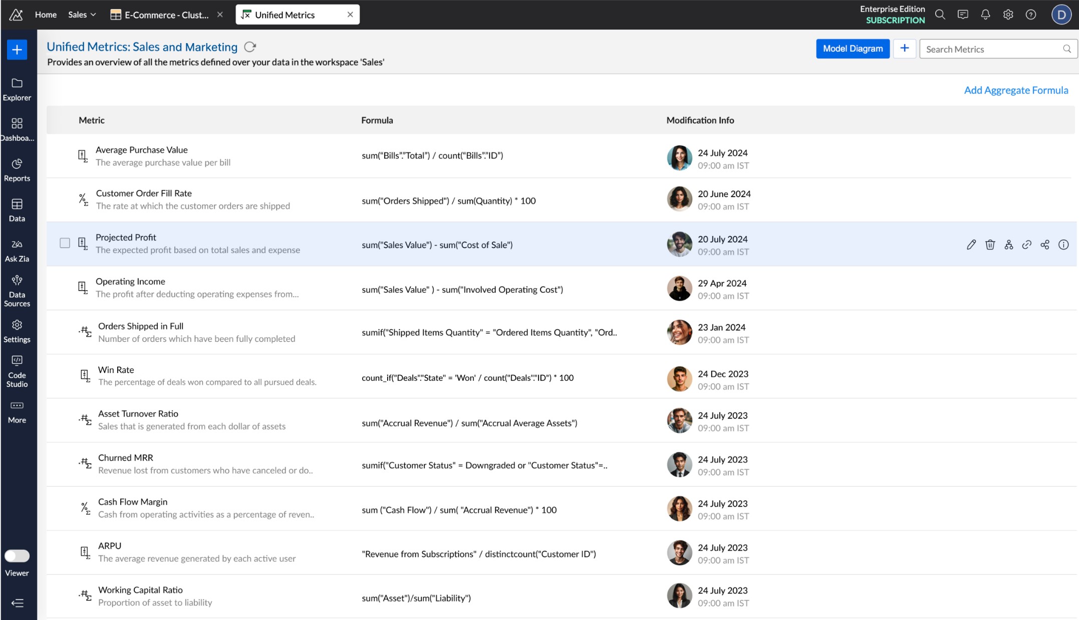 Zoho Analytics 6.0 upgrades include new data modeling capabilities and a metrics store, above, that helps ensure consistency and promote reuse of approved metrics and measures.