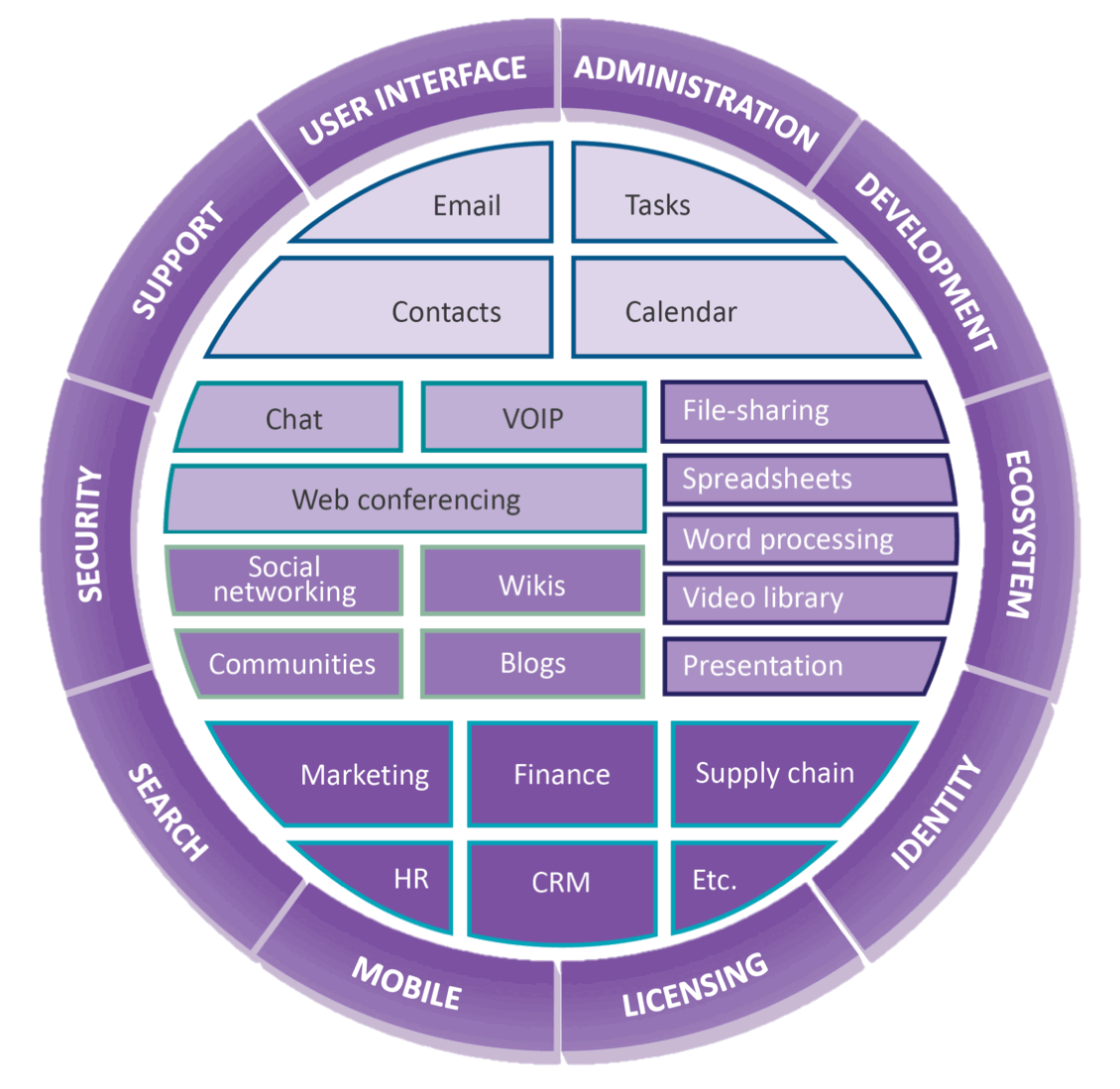 - Communication and Collaboration: Email, chat, web-conferencing, social networking, group messaging, file-sharing and project tracking