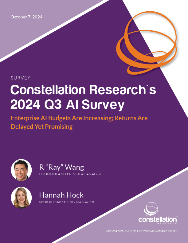 Constellationâs 2024 Q3 AI Survey provides insight to CxOs on the main drivers for business investment in AI, how much is being invested in AI, where organizations are in the AI implementation process, what AI is primarily being used to accomplish, whether there is adoption resistance to AI, and how AI will impact the workforce.