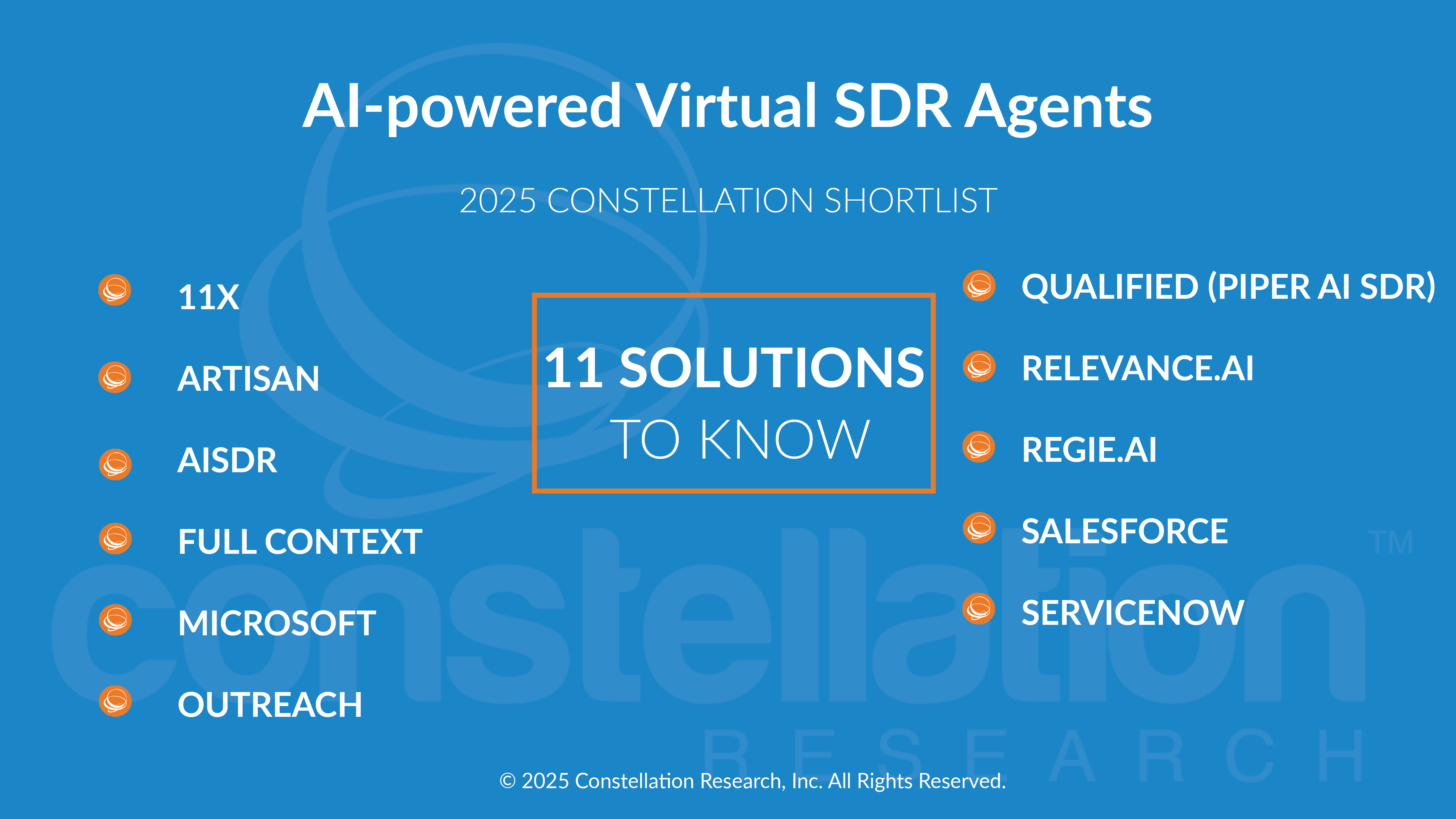 This is still a somewhat nascent area of development, and buyers should tread carefully. As with other generative AI tools, these agents are only as good as their tuning and administration and can be prone to making some mistakes/hallucinations or present other AI-created toxicity to the customer. We recommend using AI agents in conjunction with, not as replacements for, human SDR teams in the sales organization. Also, more CRM and sales automation platforms are adding out of the box agentic AI tools, and SDR agents are a popular use case – so look to value by leveraging existing investments but watch for hidden “gotcha” pricing on some CRM providers AI agent offerings.