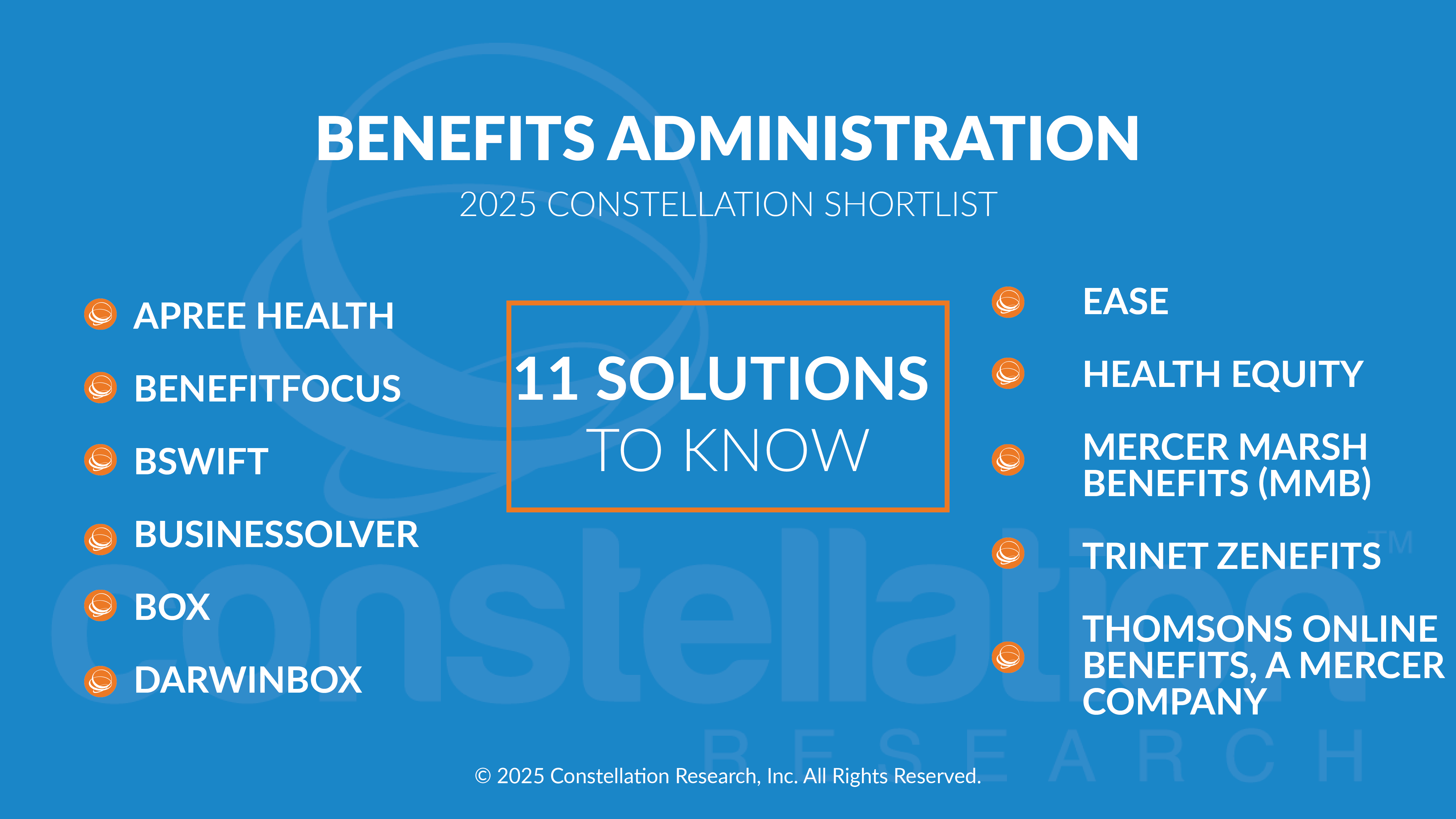 To be a benefits administration vendor, these companies need to provide regular innovation on the ease of enrollment. At the same time, they must support the benefits administrator and help turn the tables on the information war on healthcare/services providers. Moreover, they need to have out-of-the box interfaces with the leading HCM suites (see the Constellation ShortLists for Global HCM Suites and North American SMB Payroll) to help enterprises integrate and go live with ease. Listed companies must have 500+ customers in North America, and ideally support for more continents for global benefits. Key new capabilities added in 2020 are for benefits usage and dashboards.