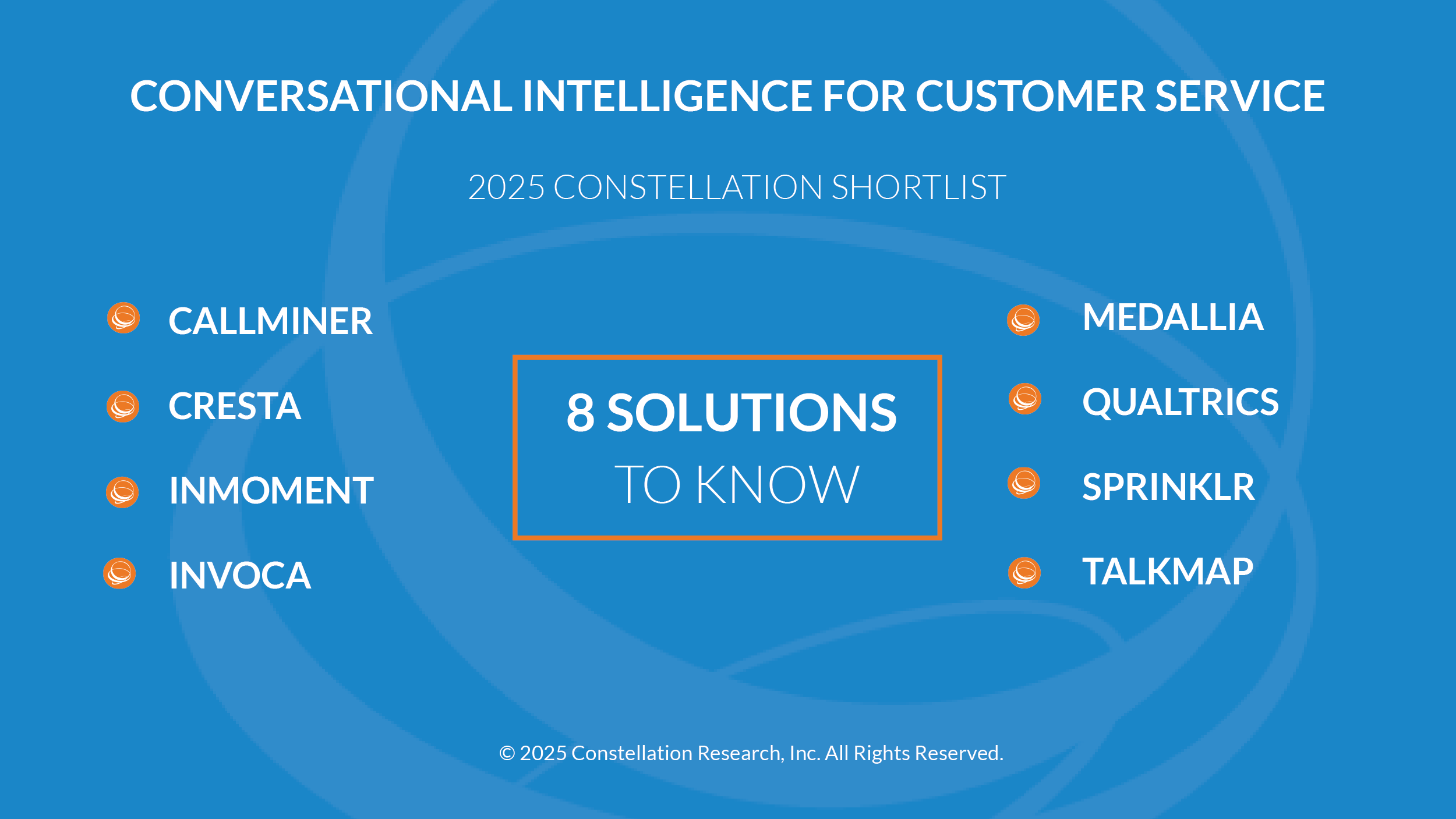 Many contact center as a service (CCaaS), customer service management (CSM) and customer relationship management (CRM) solutions now include robust conversational intelligence tools that are a critical part of their offering. Arguably solutions like NICE, Verint, Genesys, Five9, Salesforce, Zendesk, or AWS could hold spots on this shortlist. However, Constellation Research narrowed the focus for this list to only include conversational intelligence solutions that were not part of a larger customer experience platform.