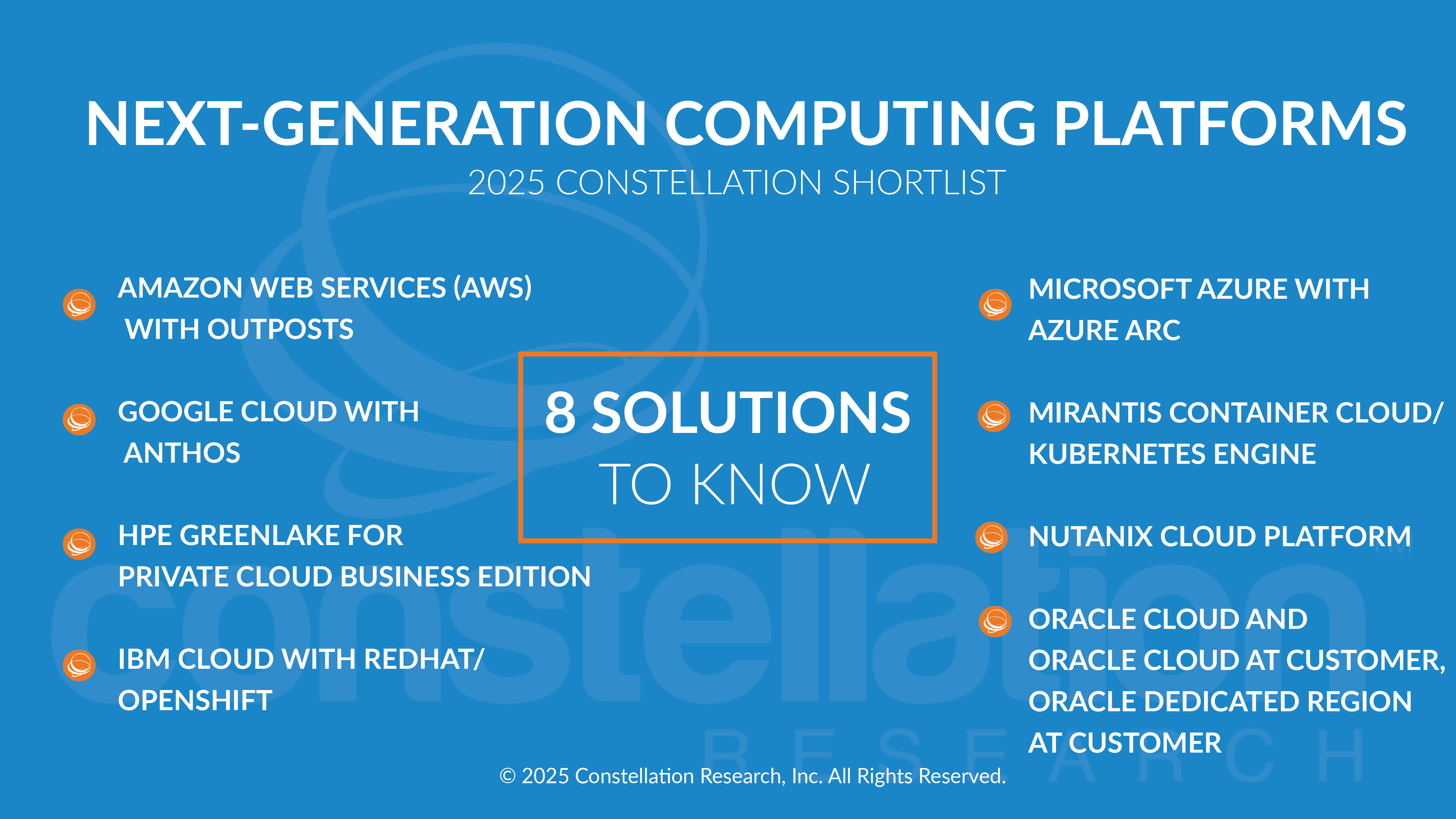 This Constellation ShortList evaluates the Next-Generation Com- puting Platforms available and includes the leading offerings that meet the requirements of todayâs CxOs. They need these platforms to offer workload portability and a single pane of glass to manage environments and workloads of their next-generation applications (for more, see here). These platforms also provide advanced services to help manage, maintain and operate these complex technology stacks. Innovation speed and elastic commercial terms are also re- quired to keep these vendors competitive in the Infinite Computing era (for more, see here).