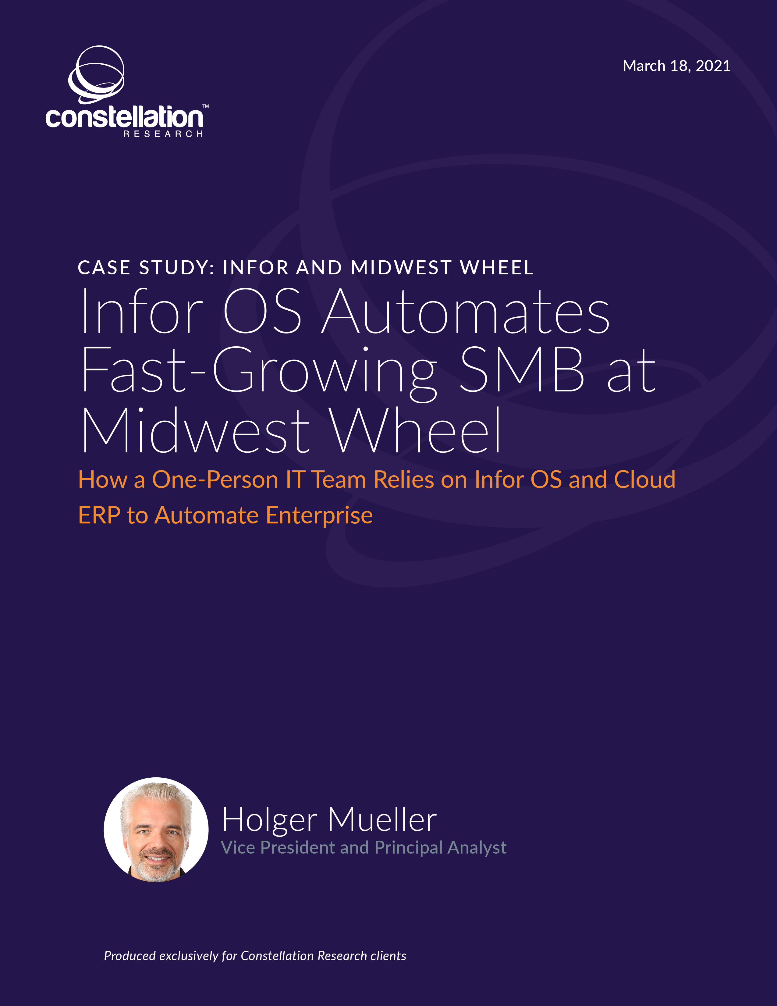 Midwest Wheel, a fast-growing small- and medium-size business (SMB) known as one of the largest truck part distributors in the midwest United States, switched from a vertical specialist to Infor CloudSuite Distribution and now successfully automates a complete enterprise resource planning (ERP) and field service offering with a one-person IT team. This case study proves that SMBs need the same tools and automation that large enterprises do and that Infor OS is a fit at both ends of the market, for even the smallest of IT teams.