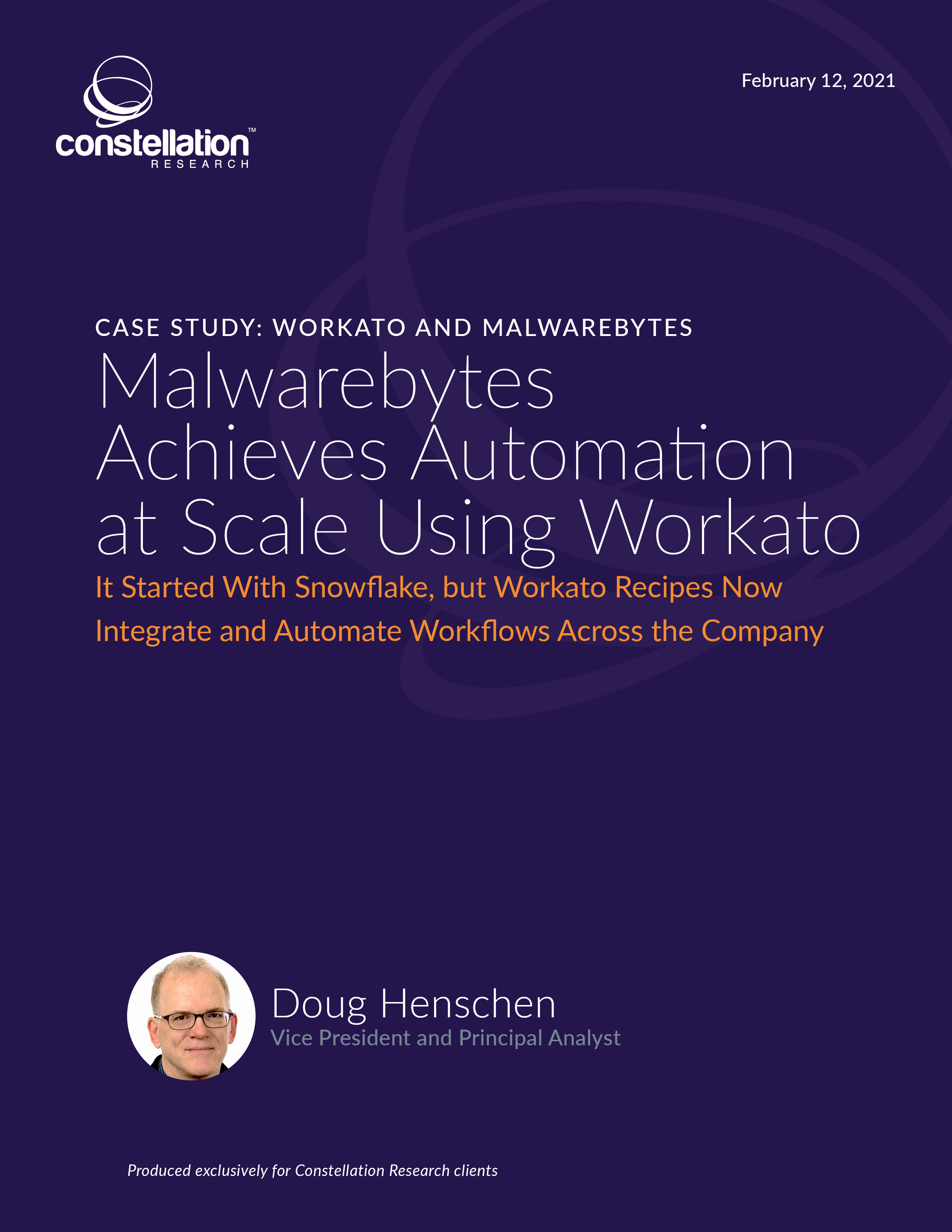 Cybersecurity firm Malwarebytes needed a better data-integration option for a new cloud-based data warehouse. Bill VanderWall, Malwarebytesâ vice president of business applications, soon learned that his chosen solution, Workato, could be used for a range of business-changing integration and automation projects. Amy Jorde, senior integration engineer at the company, has since uncovered and tackled myriad time-, labor- and money-saving projects. This case study examines Malwarebytesâ use of Workato in several integration and automation scenarios that exploit the productâs extract-transform-load (ETL), API management, workflow and automation capabilities.