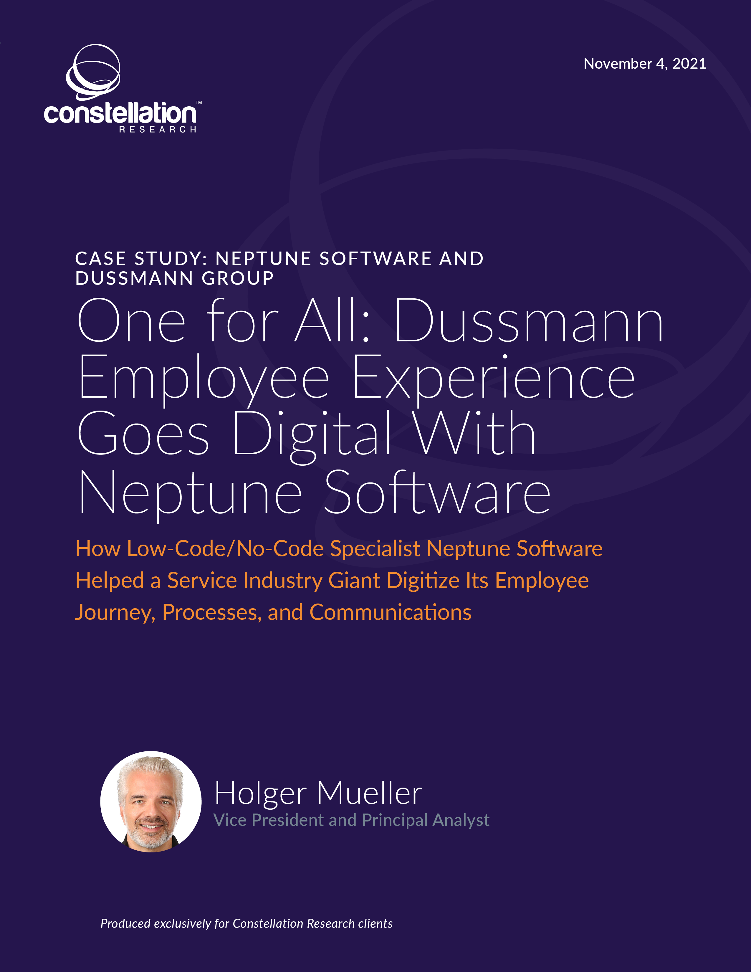 This case study describes the rollout of an employee portal solution at Dussmann Group, a global services company headquartered in Berlin, Germany. After describing the initial challenges Dussmann was facing, the case study describes the solution built with Neptune Softwareâs low-code app development platform and its impact on the company, and it closes with a set of tangible recommendations.