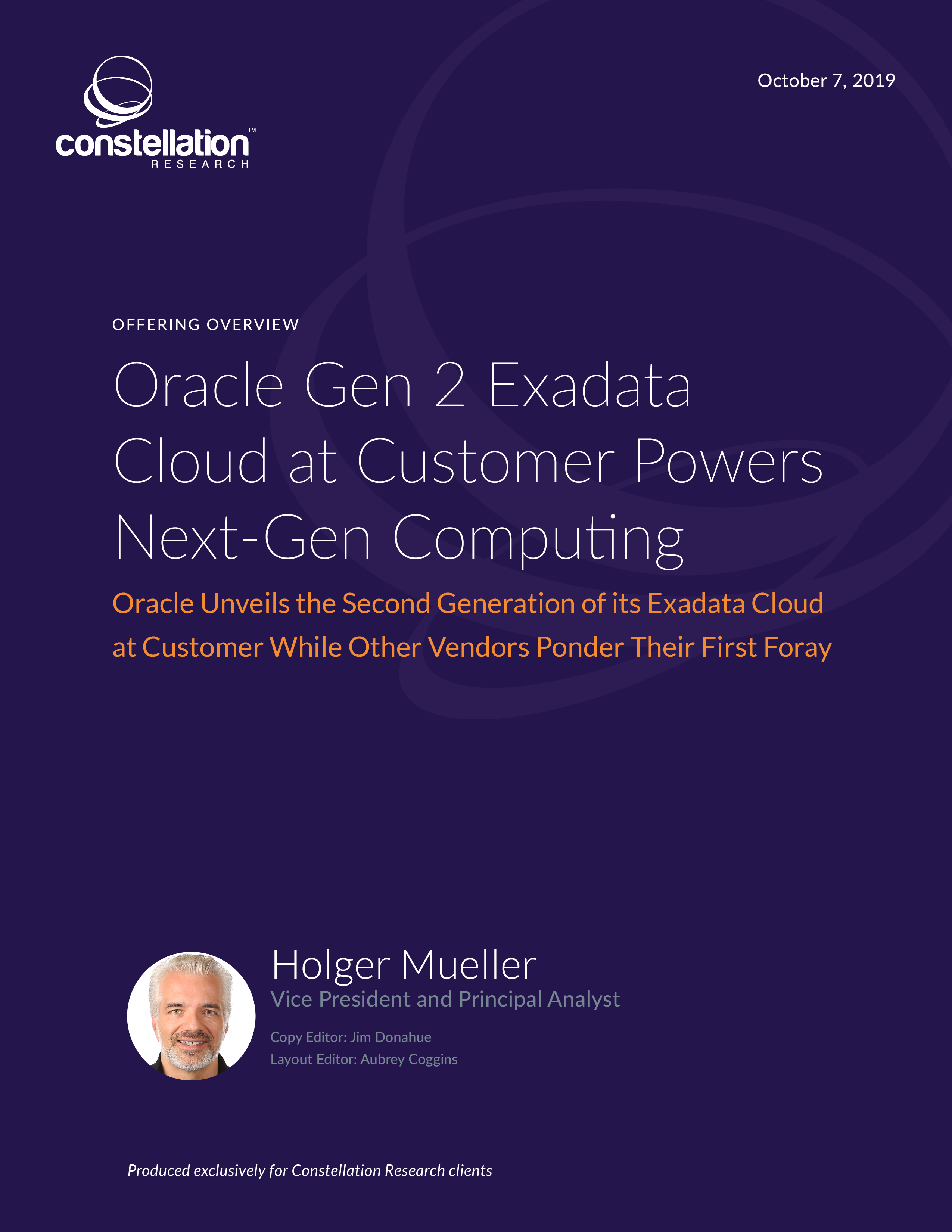 This report provides an overview of Oracle Gen 2 Exadata Cloud at Customer and analyzes its capabilities to meet enterprisesâ needs for a next-generation computing platform that would allow them to deploy workloads across both on-premises environments and the public cloud. Along with the new capabilities of Oracle Gen 2 Exadata Cloud at Customer, we look at the overall value proposition of Oracle Exadata Cloud at Customer for enterprises.