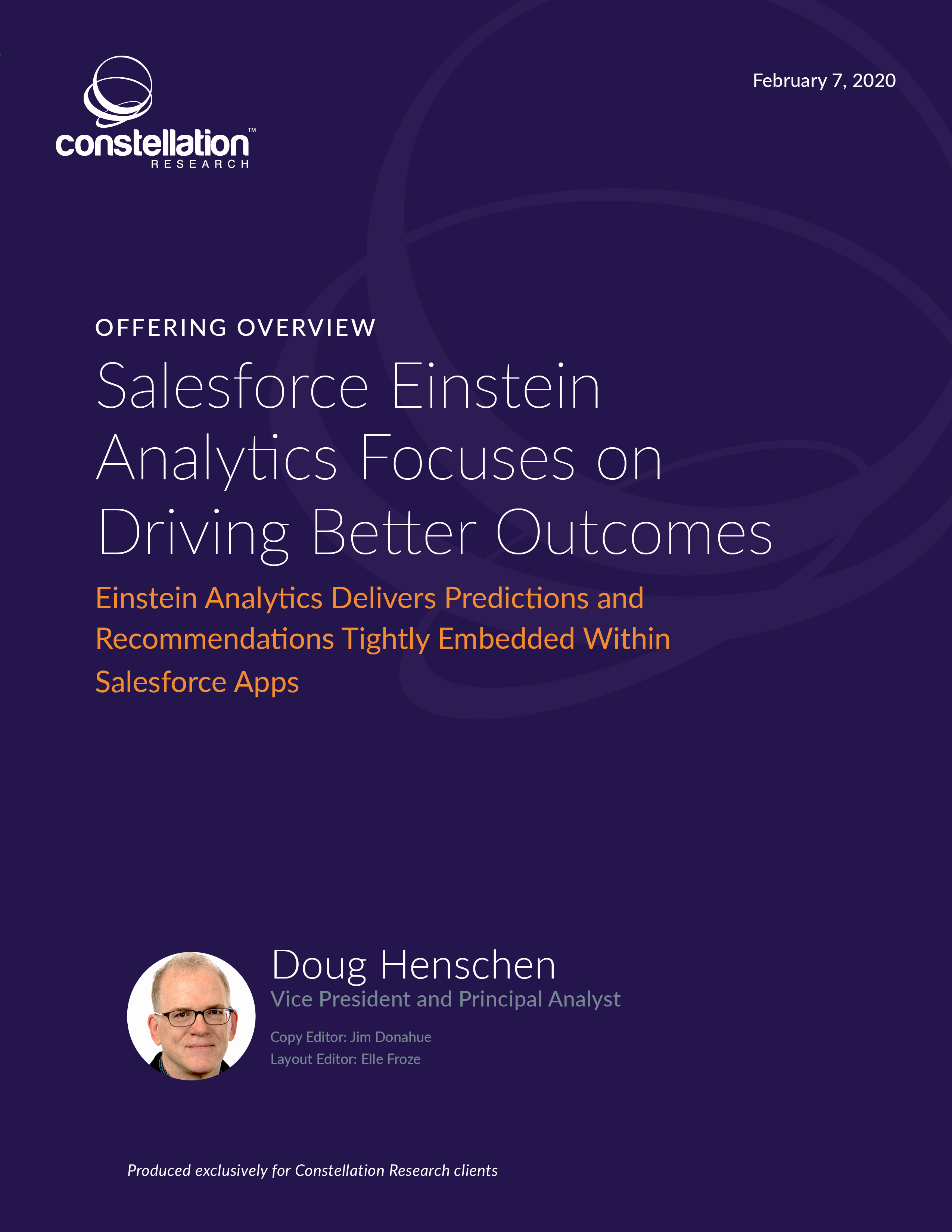 This Offering Overview examines Salesforce Einstein Analytics. This report identifies key differentiators, examines functional capabilities, considers the offeringâs strengths and weaknesses, and provides use cases. Technology buyers should use this report to evaluate Einstein Analytics for implementation.